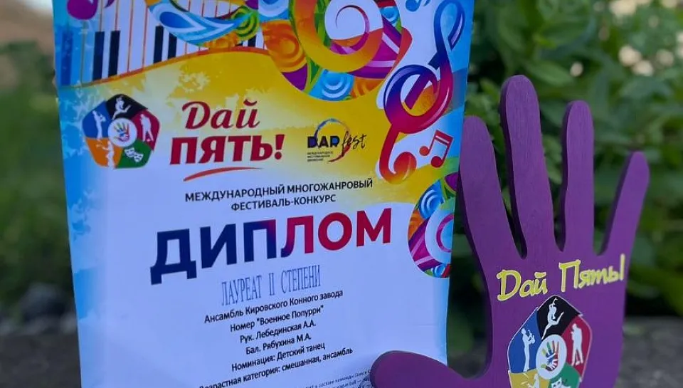 Детский ансамбль Кировского конного завода стал лауреатом II степени VIII Международного многожанрового фестиваля-конкурса детского и юношеского творчества «Дай пять!». Мы от всей души поздравляем наших юных артистов и желаем больших творческих успехов!!!